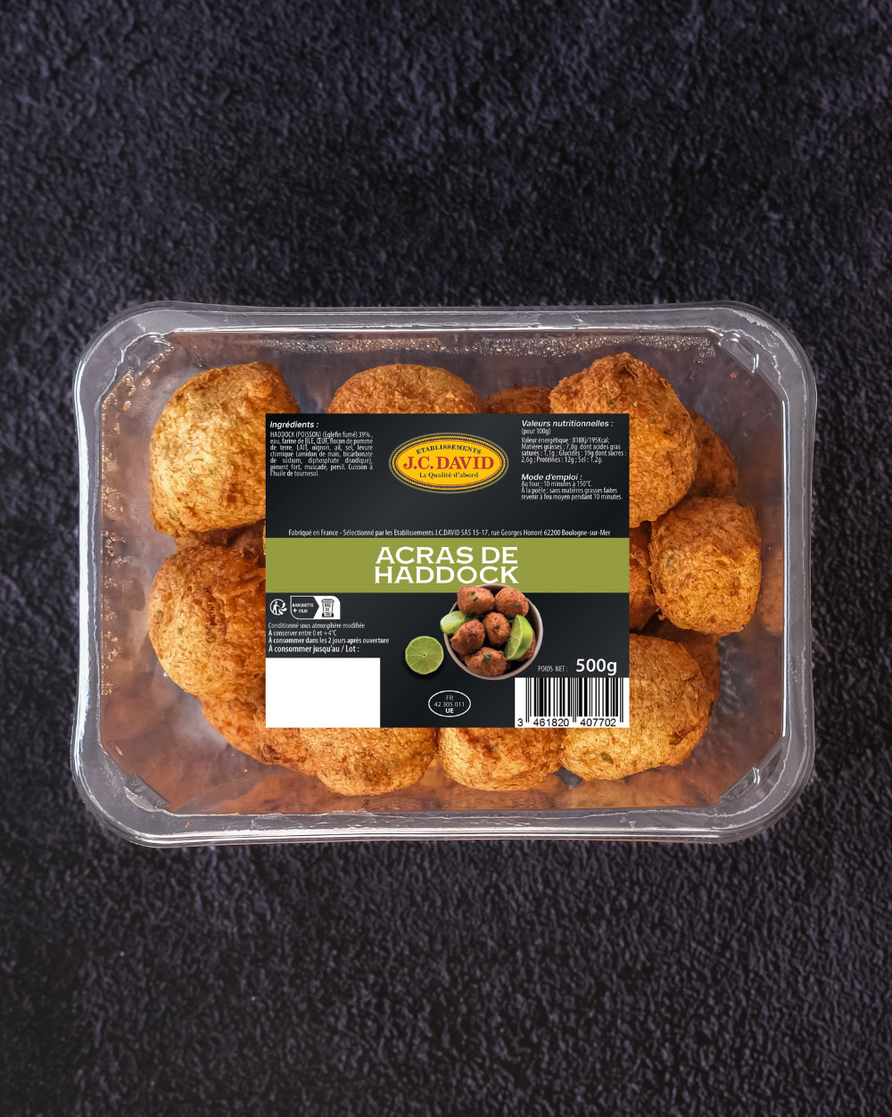 Ingrédients : HADDOCK (POISSON) (Eglefin fumé) 39%, eau, farine de BLE, OEUF, flocon de pomme de terre, LAIT, oignon, ail, sel, levure chimique (amidon de maïs, bicarbonate de sodium, diphosphate disodique), piment fort, muscade, persil. Cuisson à l'huile de tournesol.